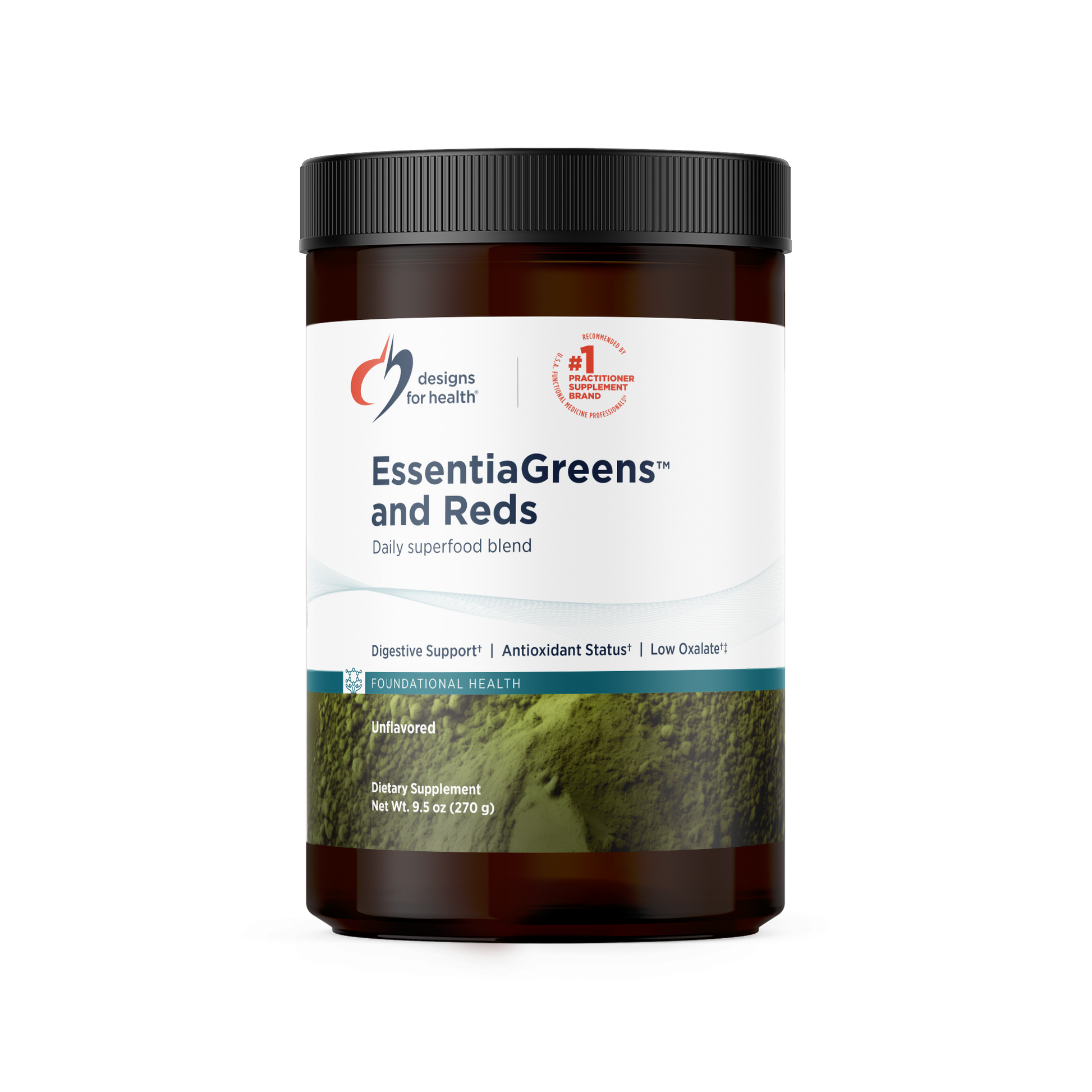 EssentiaGreens™ and Reds is a great-tasting superfood blend of greens, vegetables, and fruits designed to support nutrient status.* Superfoods are nutrient-rich foods densely packed with vitamins, minerals, and phytonutrients. It features an oxygen radical absorbance capacity (ORAC) proprietary blend supporting antioxidant status, along with digestive enzymes and prebiotics to promote digestion and absorption.* The ingredients have been carefully cultivated, harvested at their peak potency, and protected from environmental stressors to preserve beneficial phytonutrients.* It mixes easily into beverages and is made without fillers, bulking agents, grains, legumes, alfalfa, gluten, added sugar, or artificial sweeteners. Each scoop of densely packed superfoods supports antioxidant status, sustained energy, digestive health, mental clarity, healthy immune responses, and overall well-being.*
