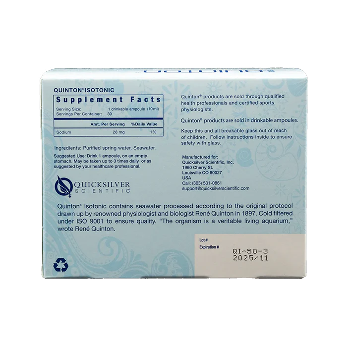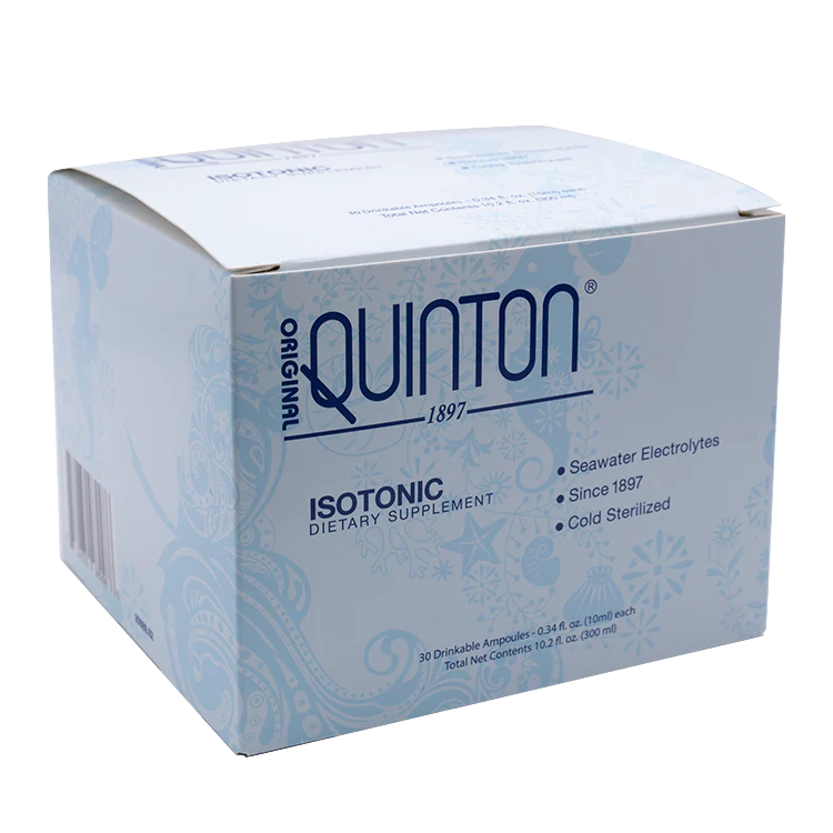 Quinton Hypertonic is mineral rich sea water containing organo-complexed (100% bioavailable & predigested) minerals from plankton-rich harvesting locations. The solution of 78 naturally occurring minerals, trace elements, and electrolytes rejuvenate the body & promote hydration.